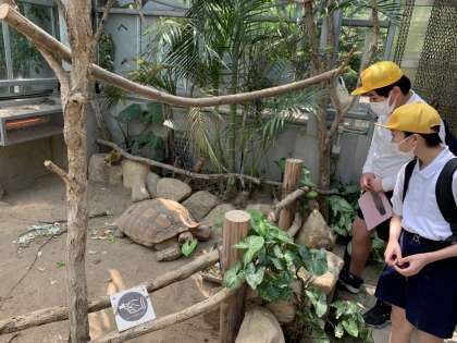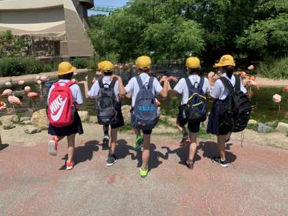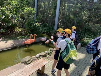 たくさんの動物とふれあっています。思わずフラミンゴの気分になりました。