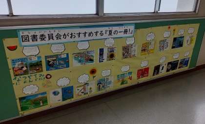 図書委員会が「夏休みに児童が読んでみたらいいよ」という、おすすめの一冊を図書室前に掲示してくれました。紹介文が楽しく、本を手に取りたい気持ちになります。