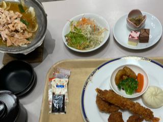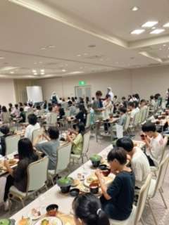 エビフライにトンカツ、牛肉のすき焼きなどなどひとり一つずつ用意された豪勢な夕食に舌鼓をうちながら食べている児童たちです。