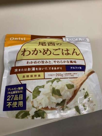 朝食に昨日の災害用のパンや軽食、除去食対応でワカメご飯を食べています。