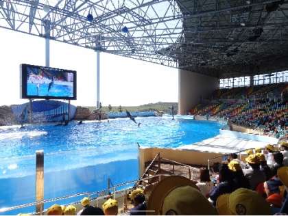 1日目はアドベンチャーワールドへ行き、いるかのショーを見ました。いるかがジャンプをしたり芸をしたりするたびに「わーっ!」と歓声が起こりました。