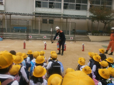 写真は消火訓練の様子です。消火器の使い方を「ピン・ポン・パン」と語呂合わせで教えていただき、子どもたちは口々につぶやいていました。