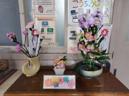 左 カーネーション、スターチス 中 アルストロメリア 右 ストック、アルストロメリア
