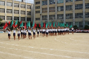 5・6年生はフラッグを使ったり、組体操を取り入れたりしていました。