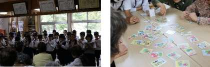 その後、グループごとに、かるたや百人一首、お手玉、トランプなどの遊びをしました。どのグループも楽しい声が響いたり、笑い声が聞こえたりして、一緒に楽しく過ごすことができました。