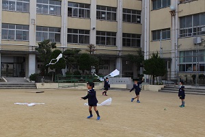 1年生が生活科で凧上げをしました。凧が上がると、「やったー!」と喜んでいました。