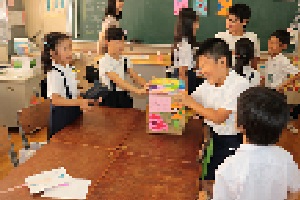 土曜授業の日、スクールフェスタがありました。講堂に集まり、諸注意などを聞いて、いざ、ゲームの準備!そして店番やお客に分かれて、いろいろなお店でゲームを楽しみました。終わった後は、どの子も「楽しかった!」と満足げでした。縦割りのつながりを深めるいい行事になりました。