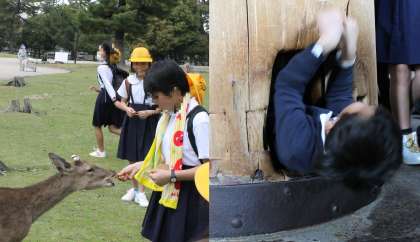東大寺では、初めて見る大仏に驚く児童も多くいました。大仏の鼻の穴のくぐり抜けにも挑戦し、改めて大仏の大きさを感じていました。