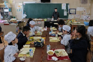 交流給食がありました。1年と6年、2年と4年、3年と5年が半分ずつ入れ替わり、一緒に給食を食べました。楽しいひと時でした。