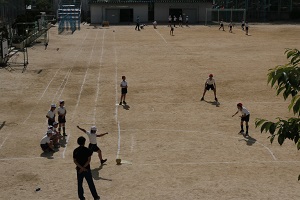 運動場運動クラブはキックベースをしていました。天気も良く、楽しそうに体を動かしていました。