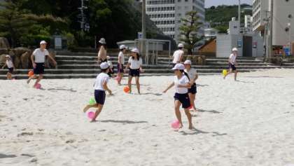 2回戦は風船割りです。足首につける風船を膨らますのに一苦労。自分の班の風船がたくさんのこった方が得点なります。全員、砂浜を走り回りました。