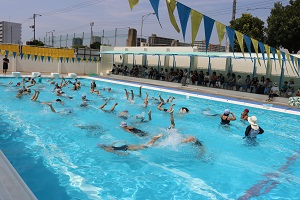 4年生です。水中の中で逆立ちや前回りをしていました。とても気持ちよさそうに泳ぐ姿がみられました。