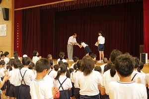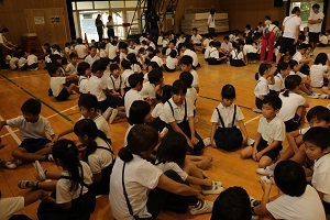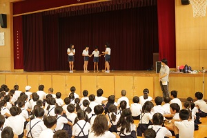 児童集会では、表彰がありました。そのあと、たてわり班で、ゲームをして盛り上がりました。「キャッチ」といわれたら、隣相手の指をキャッチするゲームで、「キャット」や「キャビア」に反応し、キャッチしてしまう子どもたちもいて、とても楽しそうでした。