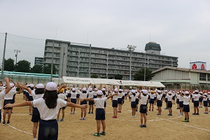 雨が続きそうなので、はやめにラジオ体操の練習を全員でしました。今日は整列のしかた、前の人にあわせて動くことの練習や、どこで体を伸ばすのかを指導してもらいました。