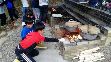 午後2時からは、今日の夕食を兼ねるカレーライス作りです。野外での調理に子どもたちは悪戦苦闘。でも、おいしいカレーライスができました。