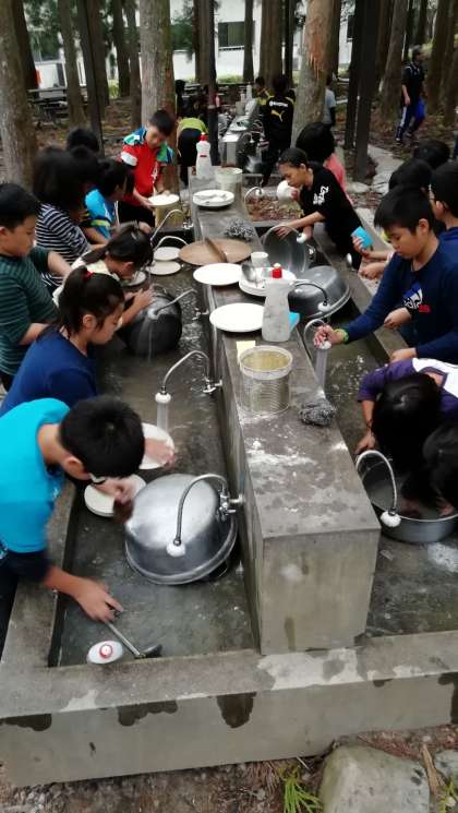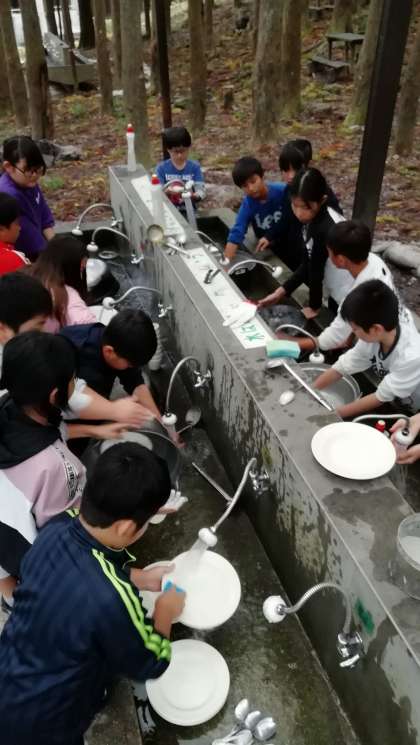 ごちそうさまの後は、後片付けです。片付けの方法を教えていただいて、全員で片付けをしました。最後にスプーンが一本足りず全員でさがしました。