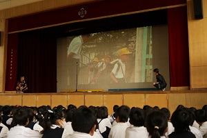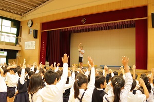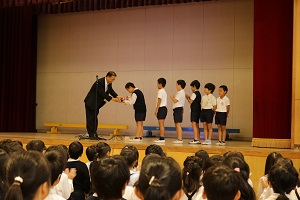 児童朝会では、表彰がありました。今週は健康週間なので、担当の先生からのお話がありました。最後に、朝の挨拶ができているのかを撮った動画をみんなでみました。しっかりとあいさつができていました。