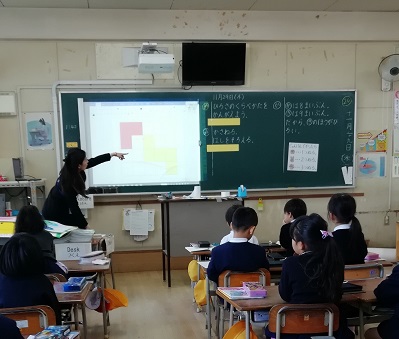 1年生が算数で「ひろさくらべ」の学習をしました。広さを比べるためには、シートの端を重ねて比べたり、決められた大きさのものを使って、「いくつ分」でくらべたりすることで調べることができることを学びました。最後に、タブレット端末を使って決められた大きさ陣取りゲームをして学習のまとめをしました。