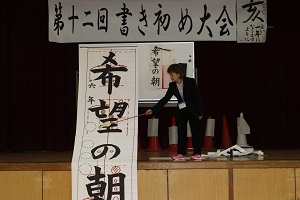 5,6年の書き初め大会でした。毎年地域の方にきていただき指導してもらいます。普段使わない大きな半紙を使うので、子どもたちは少し緊張をした様子でした。丁寧に指導してもらい、子どもたちもとても上手に書き上げていました。