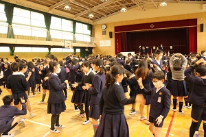 今日は児童集会でした。じゃんけんをして勝つとたまごから色んな生き物に変わっていき、最後には人間になるというゲームをたてわり班でしました。