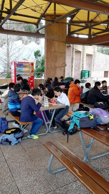 6年生はひらかたパークに卒業遠足に来ています。午前の活動を終え、お弁当を食べています。