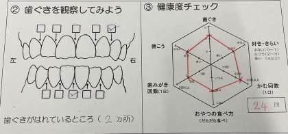 健康な口の中の写真と歯周病の口の中の写真を見比べて違いを考えたあとに、鏡を見て自分の口の中を観察し、毎日の歯みがきが効果的にできているかチェックしました。また、食生活を振り返って、食事やおやつの食べ方も歯と口の健康につながっていることを学びました。歯ブラシの使い方やみがき方、歯みがきをするときの姿勢についても学んだので実践していきたいですね。
