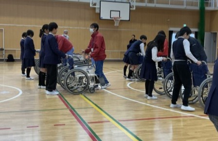 車椅子の扱い方や走行などの学習をおこないました。車椅子に乗っている人を気にかけながら、スピードや段差に気をつけて介助をしていました。学習を通して感じたことをこれからの生活にいかしてほしいと思います。
