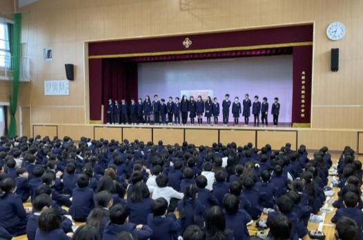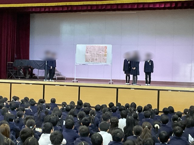 劇を通して、新聞の構成や内容などを分かりやすく伝えてくれました。毎月、関心を引く記事で新聞を発行しています。給食室横に貼り出されており、給食当番の順番待ちで話題にしている子どもたちの様子が見られます。