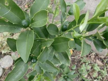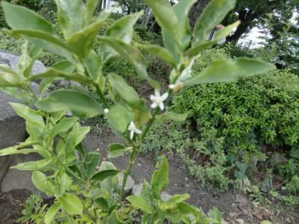 キンカン(ニンポウキンカンという種類です)は2本植えたのですが、うち1本に花が咲き、もう1本に実がなっています。ちょっと不思議な光景です。葉が食されているのも見えるかと思います。実の黄色くなるのが楽しみです。