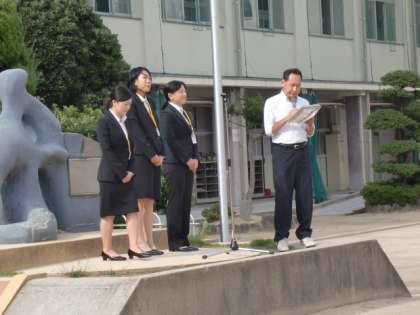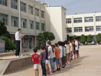 今日の児童朝会では、今日からスタートする教育実習生3名の紹介と、夏休み中の泳力記録会に参加した児童への賞状授与がありました。