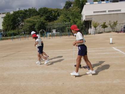 昔あそびをとおした体力づくりを図るため、「がんばる先生支援」事業予算にて購入した「木製ぽっくり パカポコ」。活用第1号は、運動会での4年生個人走「パカポコ ぴょんぴょん ゴーゴゴー!!」です。