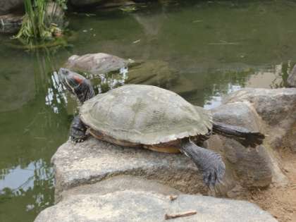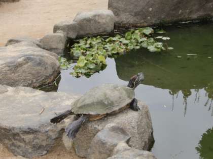 亀が首をぐぐっと前に伸ばし、前足を腕立て伏せのように突っ張り、後足もびしっと後ろに伸ばしています。しかも体は、みんなが体操している方にきっちり向いているのです。どう見てもこれは、亀の体操です。亀もきっと、運動会を楽しみにしているのでしょうね。(発信:副校長 岡田香子)