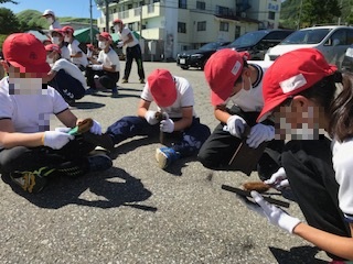 一生けんめいにみがいた焼き板に、絵付けをしています。