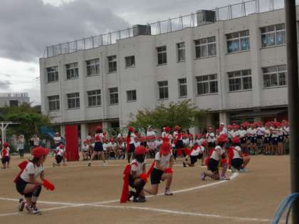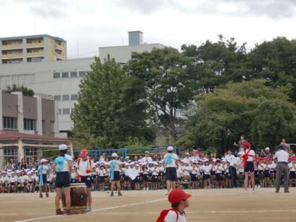 放課後一生懸命に練習してきた応援団。一糸乱れぬ動きで、声をからして応援しました。児童席の子どもたちも、力いっぱい応援しました。