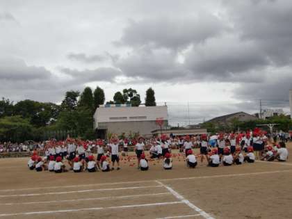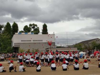 スタートは「妖怪体操第一」の踊りから。音楽がピタッと止まったところで、玉入れを始めます。たくさん入りました。