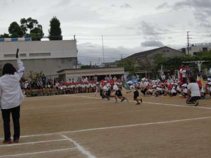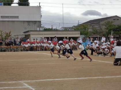 1年生 徒競走。一生懸命手を振って、まっすぐにゴールを目指します。