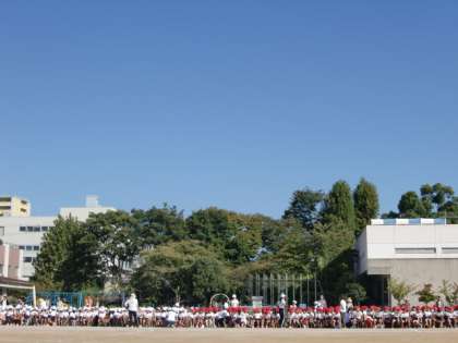 青い空に、えの森のみどり、白い体操服と赤白帽子が映えています。
