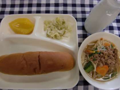 タンタンめん、キャベツの甘酢づけ、黄桃缶詰