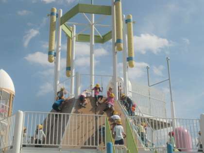 ラグビーの聖地といわれるだけあり、マンホールの図柄までがラガーマンたちでした。公園の広場には、大きなラグビーボール型の遊具、ターザンロープ、長〜いスライダーなどがあり、楽しんで遊ぶことができました。