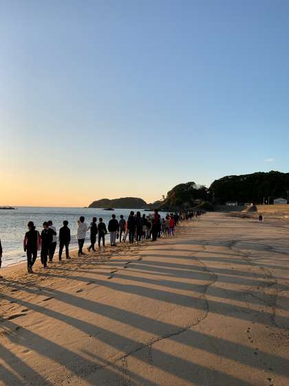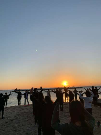 綺麗な日の出と共に海辺でラジオ体操をして、頭と体を目覚めさせています!