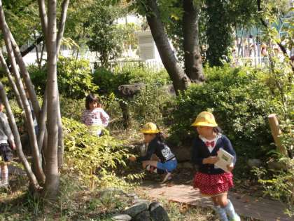 秋見つけに夢中の子。丸太グラグラバランスに夢中の子。えの森は、子どもたちをとりこにする魅力の宝庫です。(発信:副校長 岡田香子)