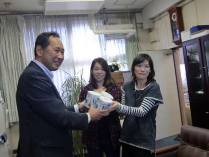PTA人権啓発委員会より、トイレットペーパーを100個、贈呈していただきました。昨年度の牛乳パックリサイクル運動の成果だそうです。