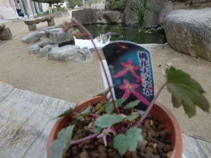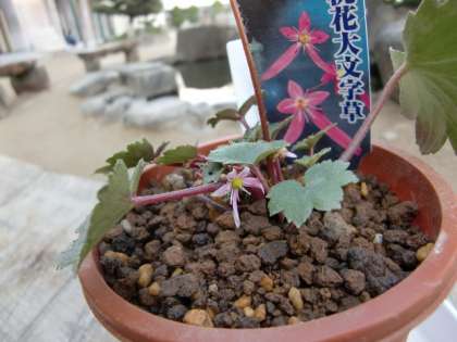 池のほとりに飾りたくて、9月から育てていた「大文字草(ダイモンジソウ)」。白花と桃花があるのですが、赤いほうの花茎がすう〜っと伸びてきて蕾がつき、そろそろ咲きそうだと思っていましたら、今朝、葉っぱの下でひっそりと一輪咲きました。