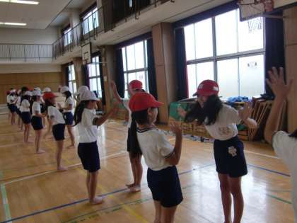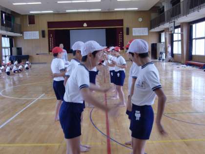 次は、学級対抗「手押し相撲」です。男子と女子が一列に並んで、一斉に対戦します。勝者の多い学級の勝利です。