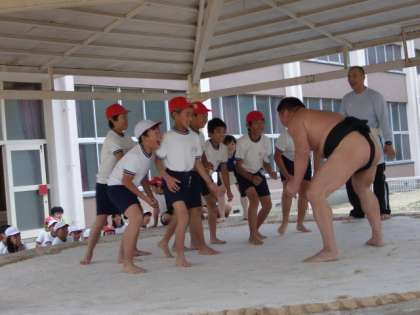 グループ代表と選手との対戦の後、やってみたい人みんなが土俵にあがり、総がかりで選手と勝負しました。