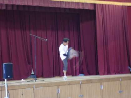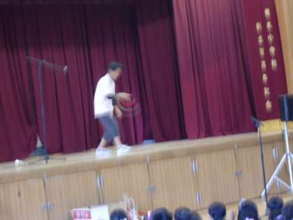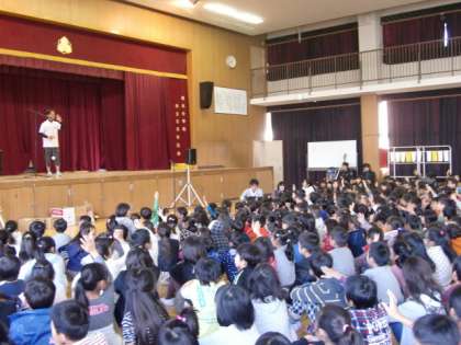 まず児童集会で、全校児童に、けん玉の技を披露していただきました。級位認定・段位認定のすべての技、宇宙遊泳や円月殺法といったウルトラ技、オリジナル技など、次から次へと繰り出される技の数々に、みんな手のひらが痛くなるほど拍手の連続でした。