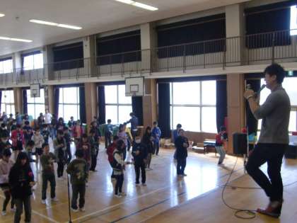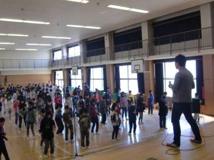 けん玉体験教室の最後は、公認ソング「けん玉」の歌に合わせての全員モシカメです。129個のけん玉の響きが、歌のリズムにぴったりと合い、感動的なラストシーンとなりました。