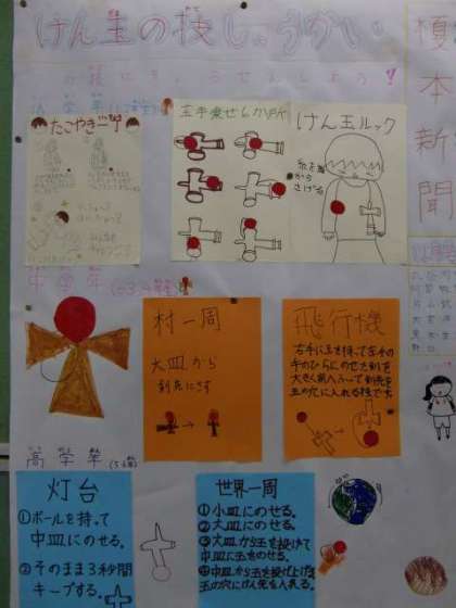 新聞委員会では、けん玉の技を紹介する新聞を作りました。イラストも上手に書けています。「けん玉ルック」も、子どもたちの印象に強く残っているようです。