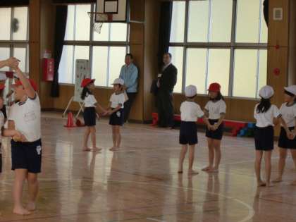 1年生は学年全体で、体育科の学習前に、音楽に合わせたバランス運動を取り入れています。