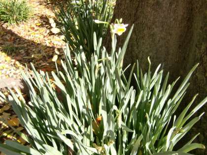 昼休みのえの森開放で、1年生の女子が見つけました。スイセンの始めの一輪です。この子は、スイセンの芽が出だしたころから、えの森開放のたびに、「どれくらい伸びたかな?」と榎の木のたもとで観察を続けていました。